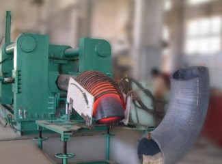 弯头推制机在生产将准备好额原材料钢管套在弯头模具芯头外,把中频感应线圈置于弯头模具芯头端部,开动冷却水泵,开启中频电源将原材料钢管加热到750°C左右,在开动弯头推制机开始推制弯头。